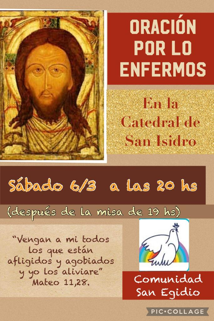 El sábado 6 de marzo, a las 20 h, tendremos un encuentro de oración por los enfermos, organizada por la comunidad de San Egidio. Los invitamos a sumarse en el templo, bajo las precauciones sanitarias pertinentes.