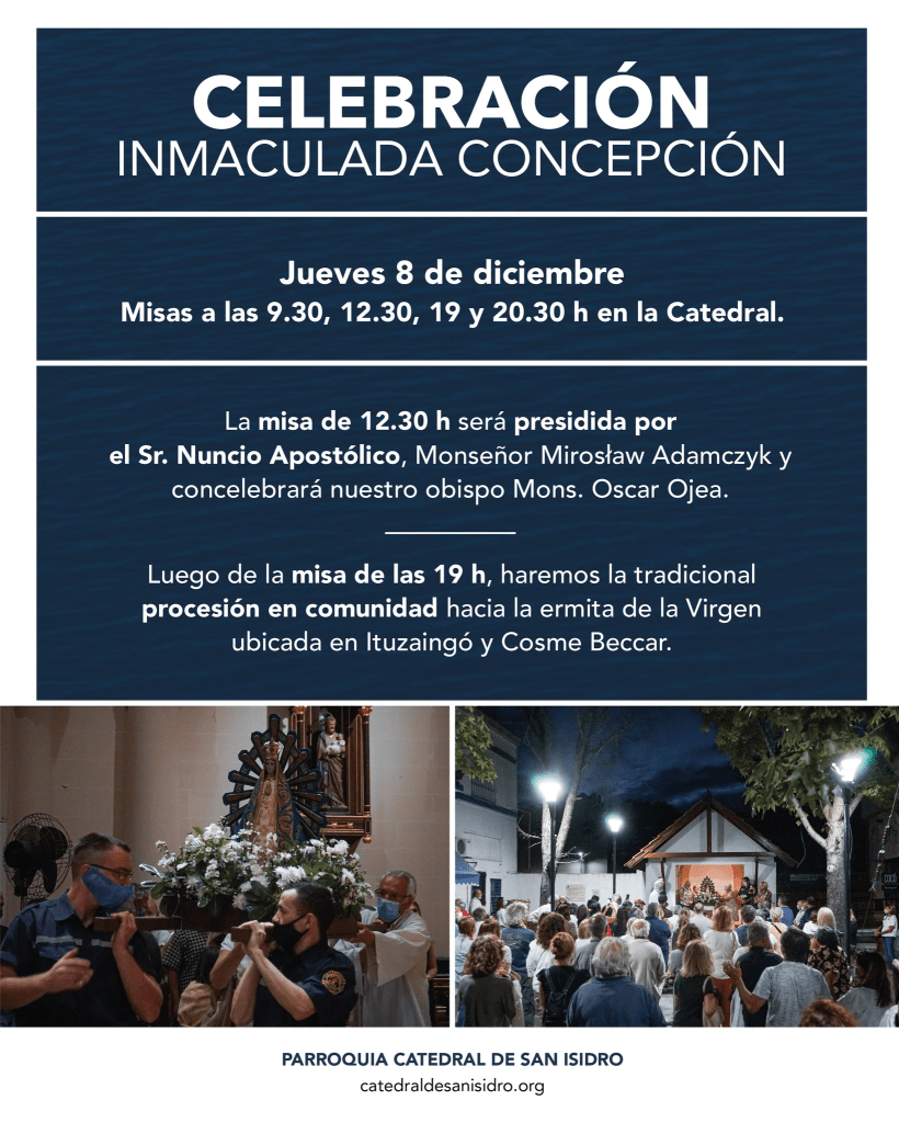 El jueves 8 de diciembre de 2022, Solemnidad de la Inmaculada Concepción, es día de precepto y las misas tendrán los mismos horarios de los domingos: 9.30, 12.30, 19 y 20.30 h.